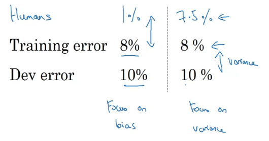 사람, train, dev에서 성능을 비교하며 뭘 해야 할지 전략을 정하자 인간의 수준을 보통 베이즈 오류의 추정치라 본다