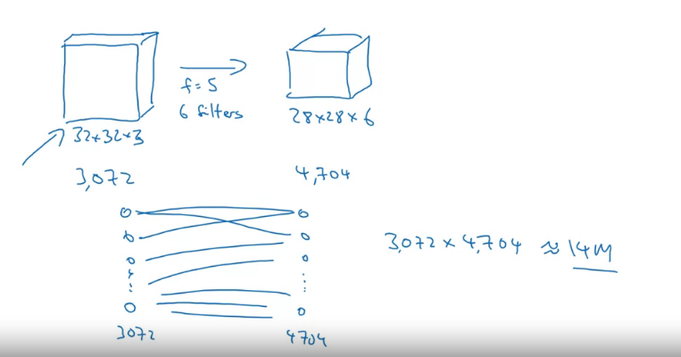 하나의 conv 레이어를 살펴보자 만약 이전처럼 모든 노드를 잇는 학습을 한다면 14000000개쯤의 어마어마한 수의 파라미터를 학습시켜야 한다