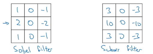 sobel filter, scharr filter 등 다양한 필터가 있다 물론 필터에 가중치를 주어 학습할 수 있다