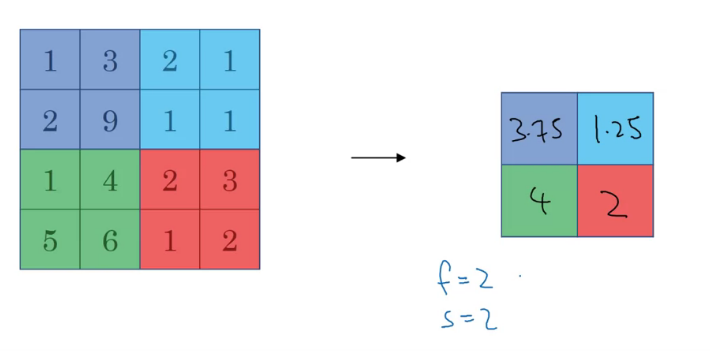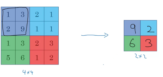 각 색의 maximum값을 취한다 \(f=2, s=2\) 인 풀링 필터를 적용했다