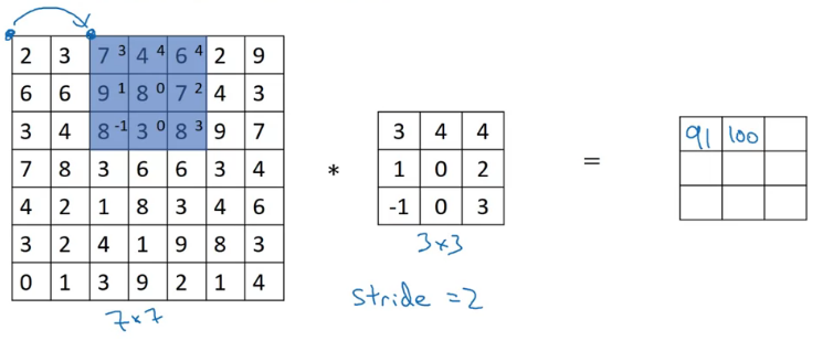 요런 너낌.. 행도 마찬가지로 점프해야한다 \((n\times n)\) 이미지를 \((f\times f)\) 필터로, p 패딩과 s 스트라이드로 합성곱을 시행하면 \(({n+2p-f\over s}+1 \times{n+2p-f\over s}+1)\)