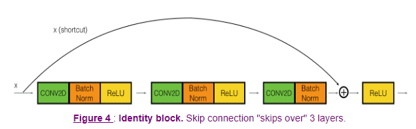 이 identity_block을 구현해 볼 것이다 앞서 강의에선 2개를 건너뛰었지만, 1 x 1을 이용한 3개의 레이어를 건너뛰는 블록을 구현할 것이다
