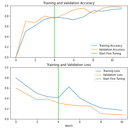 base_model = model2.layers[4] base_model.trainable = True # Fine-tune from this layer onwards fine_tune_at = 120 # Freeze all the layers before the `fine_tune_at` layer for layer in base_model.layers[:fine_tune_at]: layer.trainable = False # Define a BinaryCrossentropy loss function. Use from_logits=True loss_function=tf.keras.losses.BinaryCrossentropy(from_logits=True) # Define an Adam optimizer with a learning rate of 0.1 * base_learning_rate optimizer = tf.keras.optimizers.Adam(learning_rate=0.1 * base_learning_rate) # Use accuracy as evaluation metric metrics=['accuracy'] model2.compile(loss=loss_function, optimizer = optimizer, metrics=metrics)un-freeze한 레이어를 늘려 학습을 시작했다