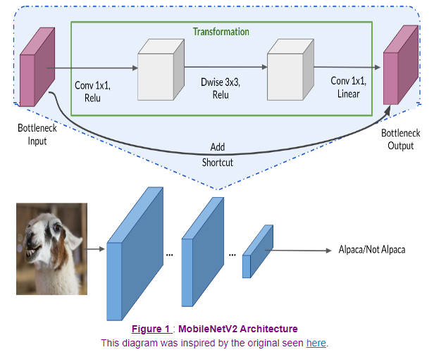 우리의 모델에 다음과 같은 bottleneck block을 넣을 것이다 IMG_SHAPE = IMG_SIZE + (3,) base_model = tf.keras.applications.MobileNetV2(input_shape=IMG_SHAPE, include_top=True, weights='imagenet')위와 같이 기존의 모델을 base_model로 설정하자