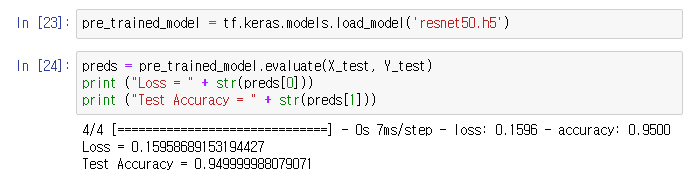 이렇게 생긴 애를 구현하자 def ResNet50(input_shape = (64, 64, 3), classes = 6): """ Stage-wise implementation of the architecture of the popular ResNet50: CONV2D -> BATCHNORM -> RELU -> MAXPOOL -> CONVBLOCK -> IDBLOCK*2 -> CONVBLOCK -> IDBLOCK*3 -> CONVBLOCK -> IDBLOCK*5 -> CONVBLOCK -> IDBLOCK*2 -> AVGPOOL -> FLATTEN -> DENSE Arguments: input_shape -- shape of the images of the dataset classes -- integer, number of classes Returns: model -- a Model() instance in Keras """ # Define the input as a tensor with shape input_shape X_input = Input(input_shape) # Zero-Padding X = ZeroPadding2D((3, 3))(X_input) # Stage 1 X = Conv2D(64, (7, 7), strides = (2, 2), kernel_initializer = glorot_uniform(seed=0))(X) X = BatchNormalization(axis = 3)(X) X = Activation('relu')(X) X = MaxPooling2D((3, 3), strides=(2, 2))(X) # Stage 2 X = convolutional_block(X, f = 3, filters = [64, 64, 256], s = 1) X = identity_block(X, 3, [64, 64, 256]) X = identity_block(X, 3, [64, 64, 256]) ## Stage 3 X = convolutional_block(X, f = 3, filters = [128, 128, 512], s = 2) X = identity_block(X, 3, [128, 128, 512]) X = identity_block(X, 3, [128, 128, 512]) X = identity_block(X, 3, [128, 128, 512]) ## Stage 4 X = convolutional_block(X, f = 3, filters = [256, 256, 1024], s = 2) X = identity_block(X, 3, [256, 256, 1024]) X = identity_block(X, 3, [256, 256, 1024]) X = identity_block(X, 3, [256, 256, 1024]) X = identity_block(X, 3, [256, 256, 1024]) X = identity_block(X, 3, [256, 256, 1024]) ## Stage 5 X = convolutional_block(X, f = 3, filters = [512, 512, 2048], s = 2) X = identity_block(X, 3, [512, 512, 2048]) X = identity_block(X, 3, [512, 512, 2048]) ## AVGPOOL X = AveragePooling2D(pool_size=(2,2))(X) # output layer X = Flatten()(X) X = Dense(classes, activation='softmax', kernel_initializer = glorot_uniform(seed=0))(X) # Create model model = Model(inputs = X_input, outputs = X) return model뭔가 무지성 복붙이라 맘에 안 드는데, 이렇게 하라니까...
