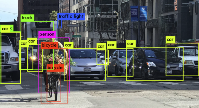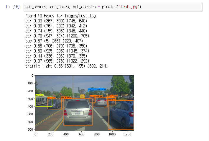 로드한 큼직한 모델, 변수만 5천만개 def predict(image_file): """ Runs the graph to predict boxes for "image_file". Prints and plots the predictions. Arguments: image_file -- name of an image stored in the "images" folder. Returns: out_scores -- tensor of shape (None, ), scores of the predicted boxes out_boxes -- tensor of shape (None, 4), coordinates of the predicted boxes out_classes -- tensor of shape (None, ), class index of the predicted boxes Note: "None" actually represents the number of predicted boxes, it varies between 0 and max_boxes. """ # Preprocess your image image, image_data = preprocess_image("images/" + image_file, model_image_size = (608, 608)) yolo_model_outputs = yolo_model(image_data) yolo_outputs = yolo_head(yolo_model_outputs, anchors, len(class_names)) out_scores, out_boxes, out_classes = yolo_eval(yolo_outputs, [image.size[1], image.size[0]], 10, 0.3, 0.5) # Print predictions info print('Found {} boxes for {}'.format(len(out_boxes), "images/" + image_file)) # Generate colors for drawing bounding boxes. colors = get_colors_for_classes(len(class_names)) # Draw bounding boxes on the image file #draw_boxes2(image, out_scores, out_boxes, out_classes, class_names, colors, image_shape) draw_boxes(image, out_boxes, out_classes, class_names, out_scores) # Save the predicted bounding box on the image image.save(os.path.join("out", image_file), quality=100) # Display the results in the notebook output_image = Image.open(os.path.join("out", image_file)) imshow(output_image) return out_scores, out_boxes, out_classes예측 함수를 잘 만들어 돌려보면...