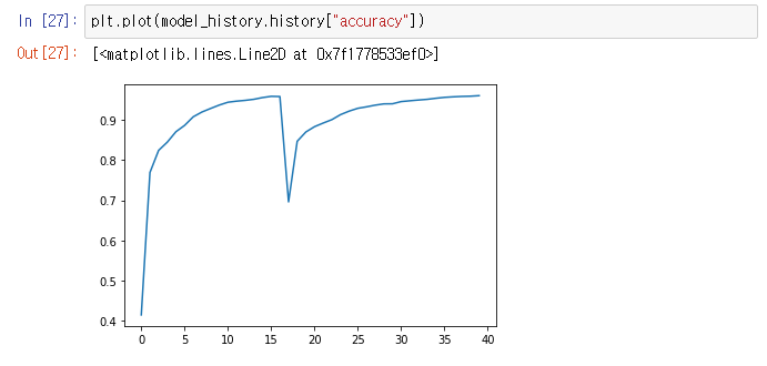 17번쯤 에포크에서 정확도가 큰 폭으로 감소하는 구간이 있는데 왜 그런지 모르겠다