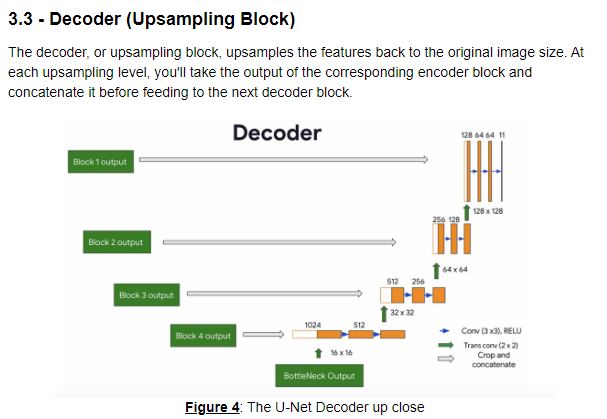 def conv_block(inputs=None, n_filters=32, dropout_prob=0, max_pooling=True): """ Convolutional downsampling block Arguments: inputs -- Input tensor n_filters -- Number of filters for the convolutional layers dropout_prob -- Dropout probability max_pooling -- Use MaxPooling2D to reduce the spatial dimensions of the output volume Returns: next_layer, skip_connection -- Next layer and skip connection outputs """ conv = Conv2D(n_filters, # Number of filters 3, # Kernel size activation='relu', padding='same', kernel_initializer='he_normal')(inputs) conv = Conv2D(n_filters, # Number of filters 3, # Kernel size activation='relu', padding='same', kernel_initializer='he_normal')(conv) # if dropout_prob > 0 add a dropout layer, with the variable dropout_prob as parameter if dropout_prob > 0: conv = Dropout(dropout_prob)(conv) # if max_pooling is True add a MaxPooling2D with 2x2 pool_size if max_pooling: next_layer = MaxPooling2D(2,strides=2)(conv) else: next_layer = conv skip_connection = conv return next_layer, skip_connection다음으로 Decoder 과정이다