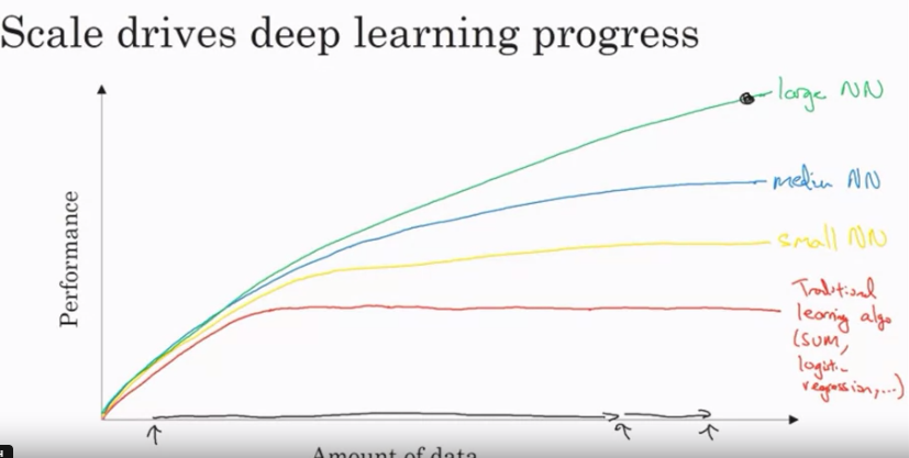 데이터의 양이 늘어나고, 큰 신경망을 처리할 계산능력 (GPU 발달 등), 효율적인 알고리즘이 딥러닝을 떠오르게 만들었다
