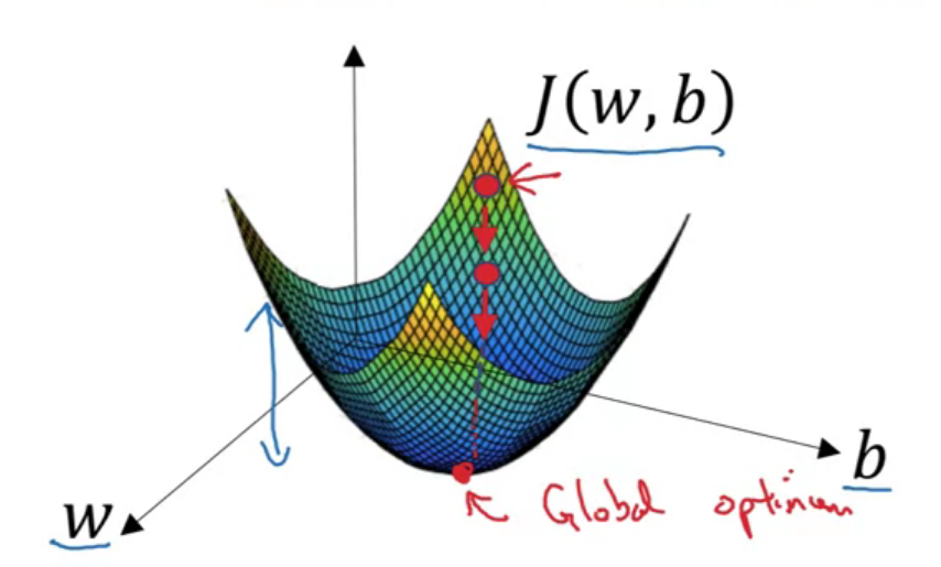 3차원 비용 함수이다 비용 함수는 convex하므로 임의의 아무 점에서 경사 하강을 이용하여 global optim에 도달 가능하다