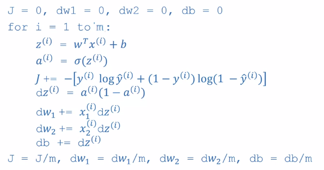 \(\mathcal{L}(a^{(i)}, y^{(i)}) = -(y^{(i)}log(a^{(i)})+(1-y^{(i)})log(1-a^{(i)}))\)각각 example에서 \({dw_1}^{(i)}, {dw_2}^{(i)}, {db}^{(i)}\)를 계산 가능하다